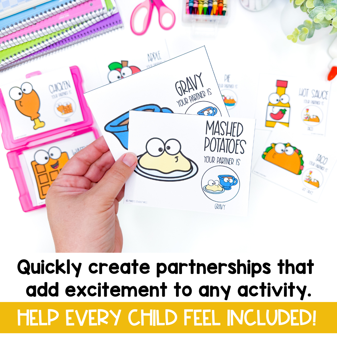 Did you love my original Peanut Butter and Jelly Partner Pairing Cards? Here is a new set that I know you and your students will LOVE. This version includes new, fun food pairings such as Chips and Salsa, Chicken and Waffles, Apple and Pie, and Mashed Potatoes and Gravy. This set of 56 adorable partnership cards will make 28 pairs of 2. With these cards, creating partnerships in your classroom is now a breeze, taking less than 2 minutes!