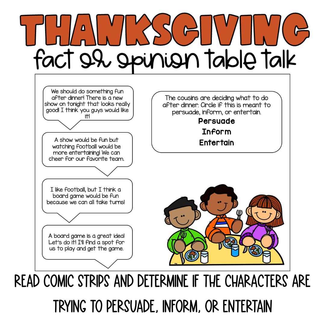 Introducing Thanksgiving-themed activities to help your students learn the difference between facts and opinions. This bundle of fun and educational activities offers students a chance to explore the holiday of Thanksgiving in a meaningful, engaging way. From task cards to reading comprehension worksheets and comic strip analysis, students will be able to identify and form their own opinions while learning how to distinguish facts and opinions.