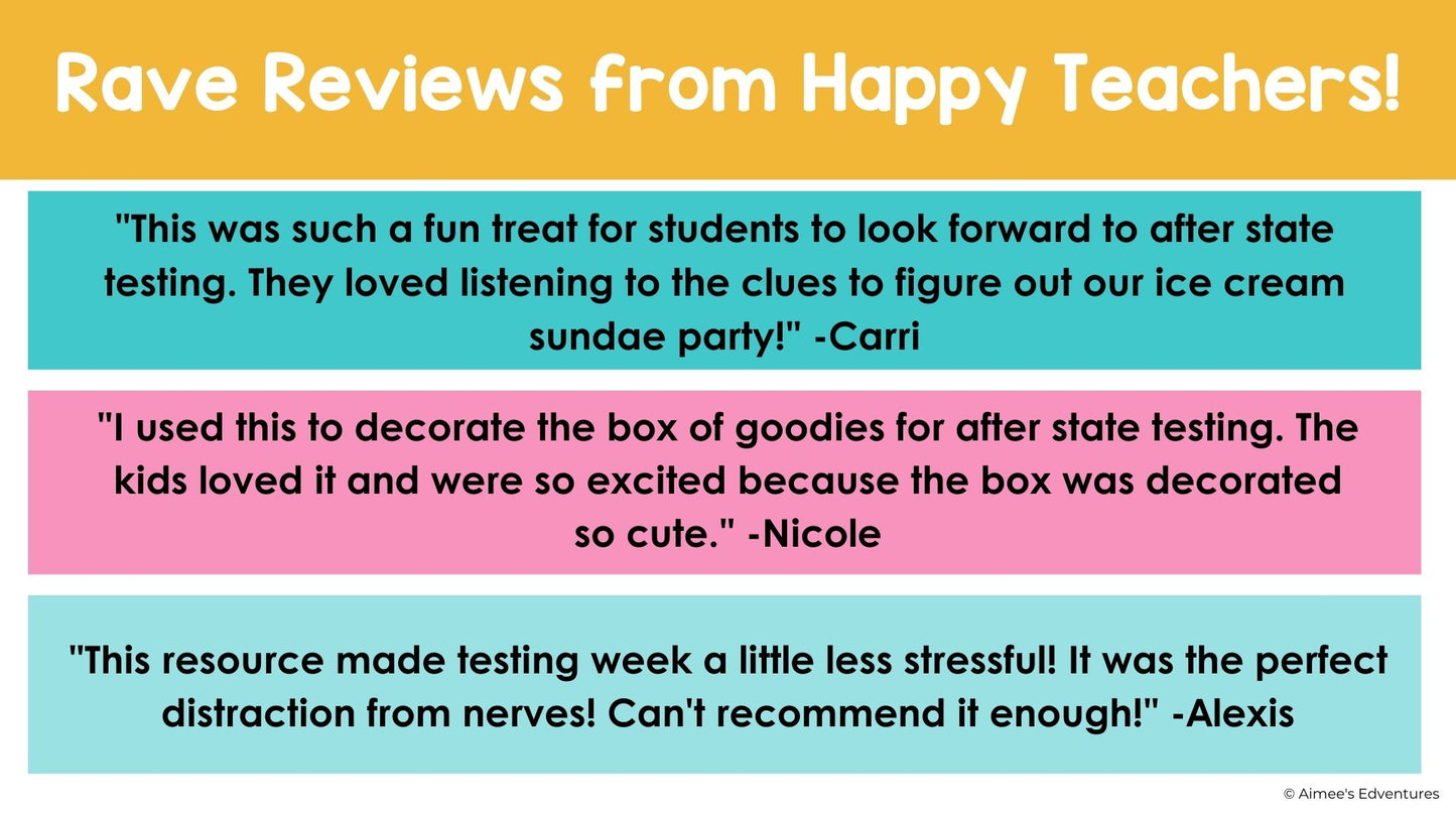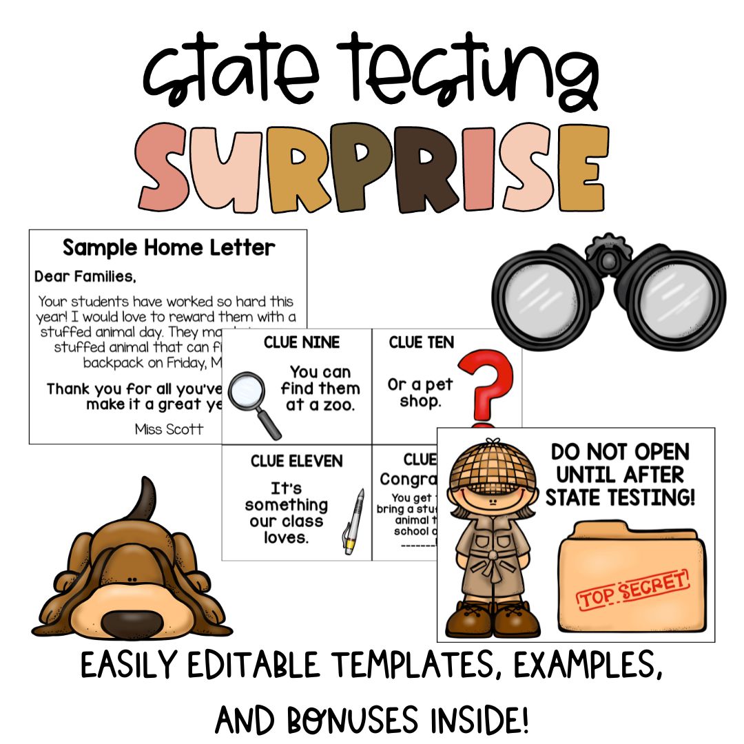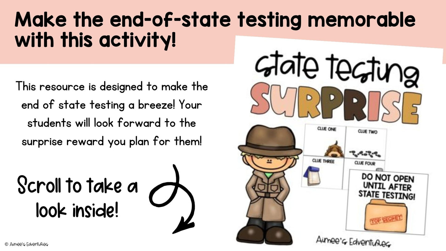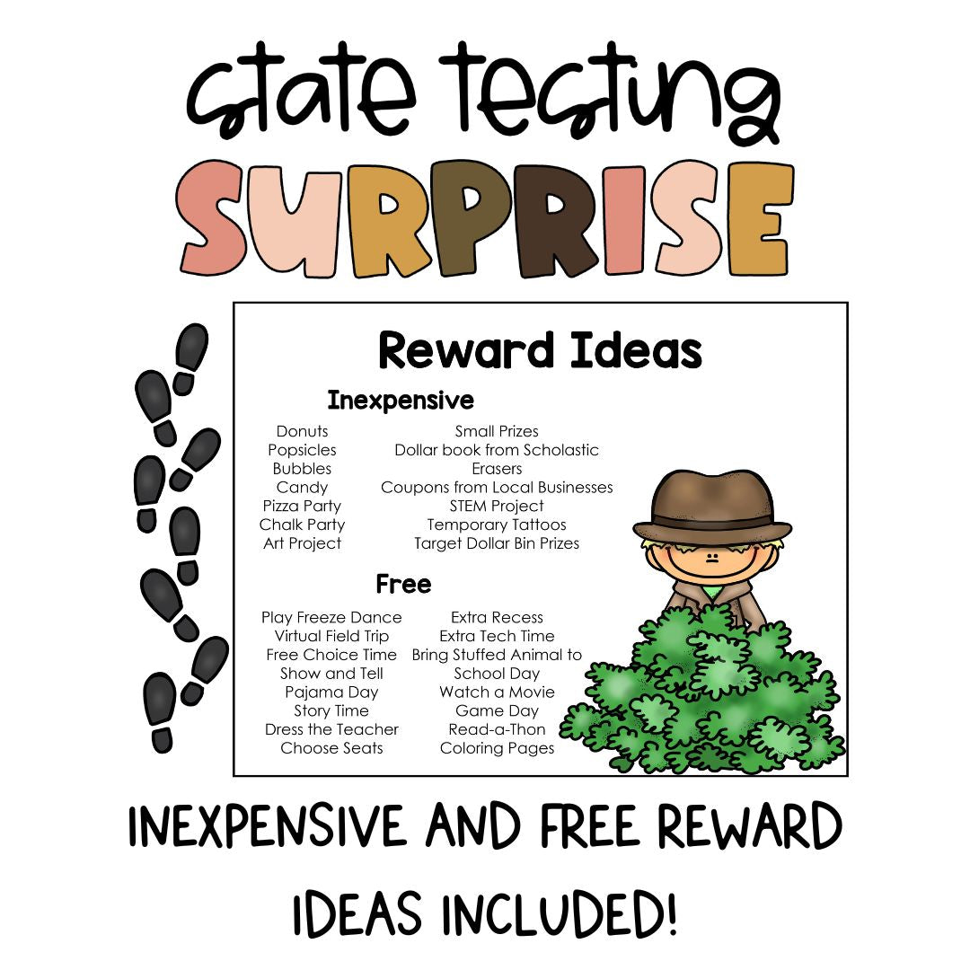 Make the end of state testing memorable with these fun reward ideas! This resource is designed to make the end of state testing a breeze. Inexpensive and free reward ideas, editable clue cards, bonus ideas for classroom transformations, and extras for bulletin boards or classroom decor are all included in this one product. It also includes do not open until after state testing signs (3 designs) for extra flair! No need to worry about reward ideas when you can quickly and easily customize this resource for you and your students. Make testing meaningful with these reward ideas and clues. Make the students excited to finish the tests with a reward. With this solution, you can make the end of years state testing stress-free and enjoyable!